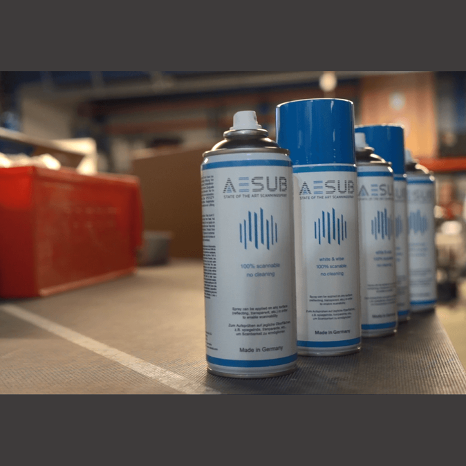 AESUB blue ist ein selbstverdampfendes Scanspray, das von Scanning-Experten entwickelt wurde. Das Spray verdampft innerhalb weniger Stunden, sodass keine Reinigung nach dem Scannen erforderlich ist. Im Gegensatz zu herkömmlichen Sprays enthält AESUB blue keine Pigmente und vermeidet somit die Pigmentkontamination empfindlicher Bereiche, wie Laboren und Produktionsstätten, Geräten und Benutzern. Sie können AESUB blue daher direkt an der Stelle des Scannens anwenden, ohne kostspieligen Transport, um die genannte Pigmentkontamination in sensiblen Bereichen zu vermeiden. Insgesamt steigert AESUB blue die Effizienz und Produktivität innerhalb der Digitalisierungsprozesse erheblich.