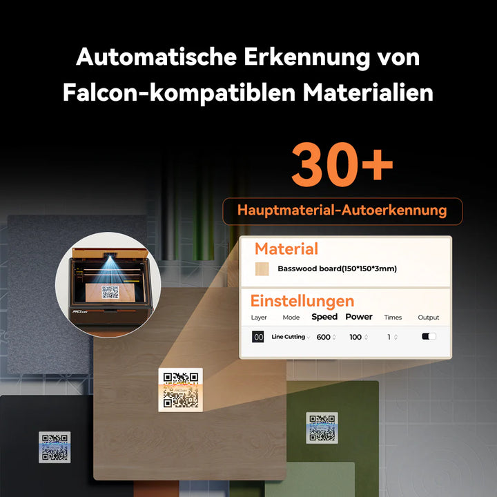 A Falcon A1 teljesen automatikusan ismeri fel az anyagokat egy beépített QR-kód rendszer segítségével.