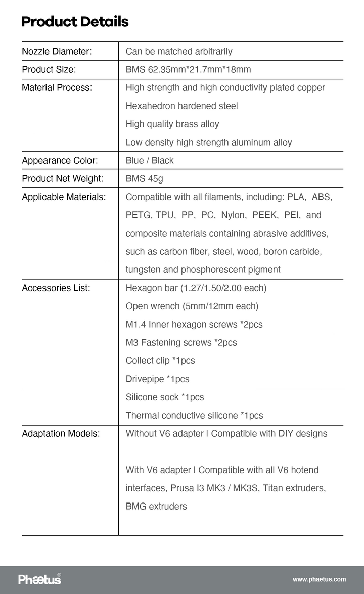 Hier sind einige technische Spezifikationen des Phaetus Dragonfly Hot-End BMS: