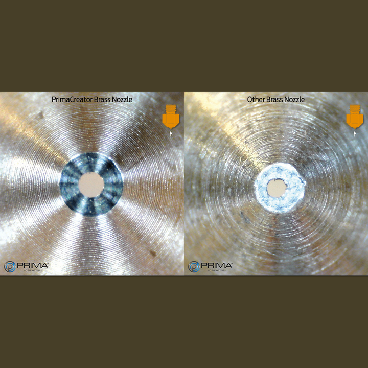 A PrimaCreator összes fúvókája kiváló minőségű sárgarézből vagy acélból készül (típustól függően), és egy csúcstechnológiás gyárban gyártják. Minden fúvóka kevesebb, mint ± 0,01 mm tűréssel készül. Ez biztosítja, hogy a filament extrudálásakor nagyon sima és tiszta felületet kapjon, ami természetesen jobb nyomtatási eredményekhez vezet.