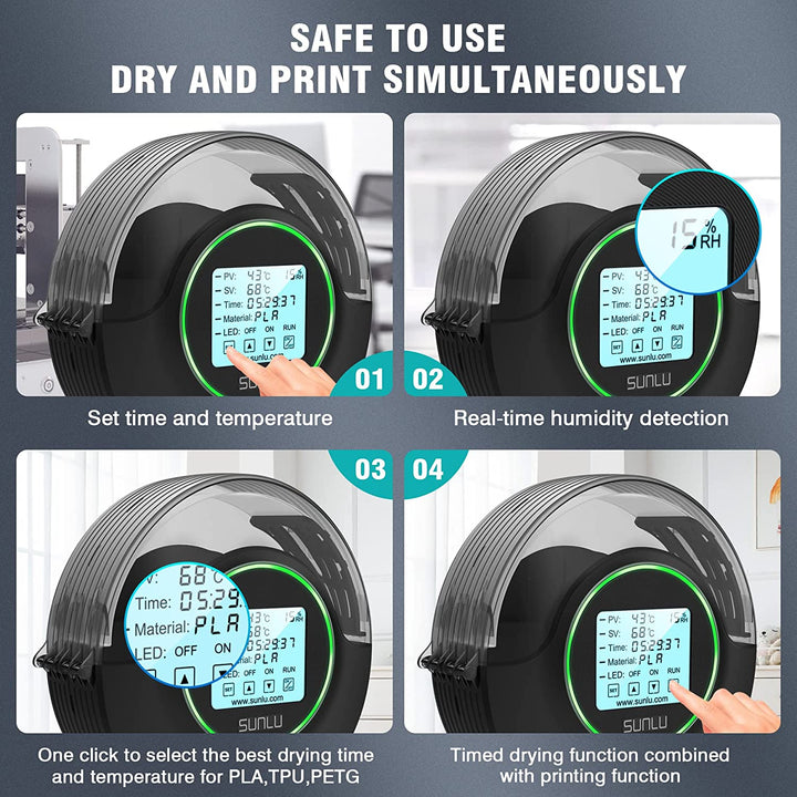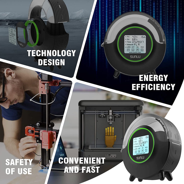 A SUNLU FilaDryer S2 egy modern szárítórendszer, amely gyorsan és megbízhatóan távolítja el a nedvességet a filamentekből. Precíz hőmérséklet-szabályozásának és praktikus érintőképernyős kezelésének köszönhetően optimális nyomtatási körülményeket biztosít minden elterjedt anyaghoz – a PLA-tól a higroszkópos filamentekig, mint a nylon vagy BVOH.